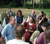 Es war einer der wenigen sonnigen und heißen Tage dieses Sommer. Drei Harfen verzauberten die Festgemeinschaft mit ihren Klängen. Die Quelle, eingefasst in große Quarzsteine, wurde von den anwesenden Kindern liebevoll mit Blumen geschmückt. Auch wurde jedem der Gäste ein Blümlein gereicht. Nach dem Eintreffen Aller reichten wir uns die Hände und der Kreis wurde geschlossen. In der Mitte die Quelle, zu ihrer Seite die Großeltern. Klein Florian, sonst immer ruhig und ausgeglichen, fühlte sich anfangs nicht sonderlich wohl. Er tat sein Unbehagen durch anhaltend tönende Unmutsäußerungen kund. Es lag an der Bauchtrage, aus der er eigentlich schon herausgewachsen war. Außer auf den Arm genommen zu werden, verlangte er noch nach seinem Taufrgewand, welches seine Mama ihm für diesen besonderen Tag hergerichtet hatte: ein kleines grünes Gewand aus Leinen mit einem langen Bernstein behangenen Zipfel. Nun war es auch viel besser und schöner. So entspannt konnten er und Sebastian dann auch den Segen der sieben Feen entgegennehmen.